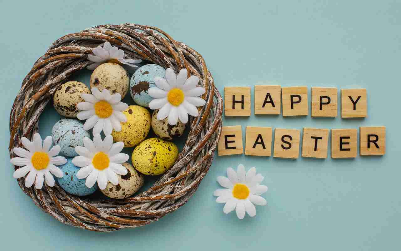 Le uova colorate, le margherite e la corona pasquale. C’è di tutto un po’ in questa graziosissima cartolina di auguri da inoltrare su WhatsApp ad amici, parenti e colleghi, che non potranno non apprezzarne il tema perfettamente primaverile.