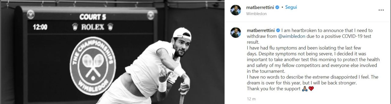 Un post su Instagram per annunciare questa notizia. Con il cuore spezzato, ha scritto Berrettini, “annuncio di essere positivo al Covid“. Pochissimi sintomi per il tennista che però non potrà partecipare alla manifestazione in quell’anno che sembrava davvero potesse essere il suo. Una situazione che non ha rimedio ovviamente, non c’è nessuna possibilità di giocare, non c’è nessuna possibilità di cambiare le carte in tavola e le regole, nonostante l’Inghilterra sia stato il primo paese a mollare quasi del tutto ogni restrizione del Covid.