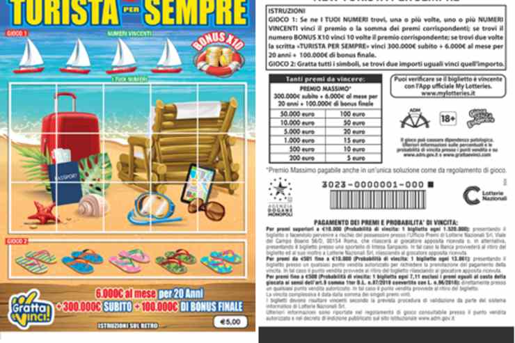 Chi trova due volte la scritta Turista per Sempre all’interno dell’area I tuoi numeri ottiene 300.000 euro come premio immediato, più 6.000 euro al mese per vent’anni e un bonus finale di 100.000 euro. In totale la vincita ammonta a quasi 2 milioni di euro. Per la precisione: 1.936.849 euro.