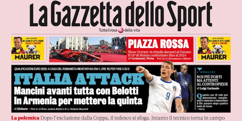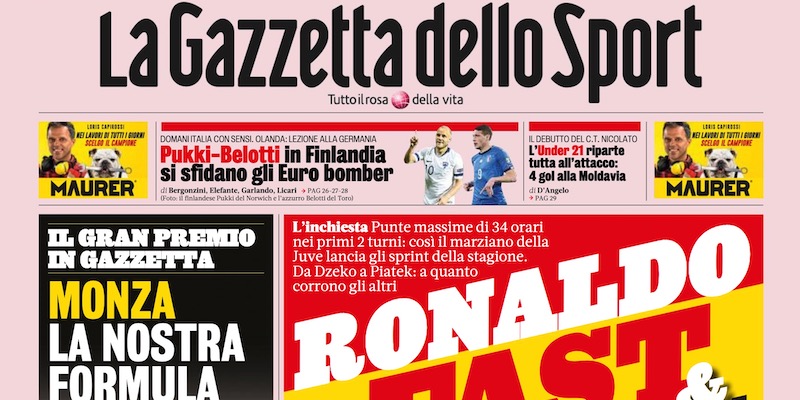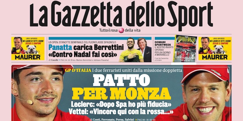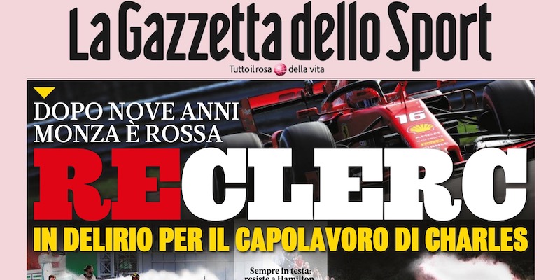La vittoria di Leclerc a Monza e quella dell'Italia di Mancini contro la Finlandia, i due principali argomenti sulle prime pagine di oggi.