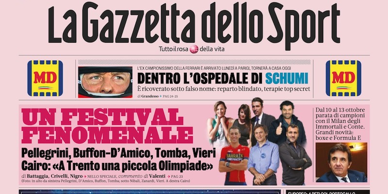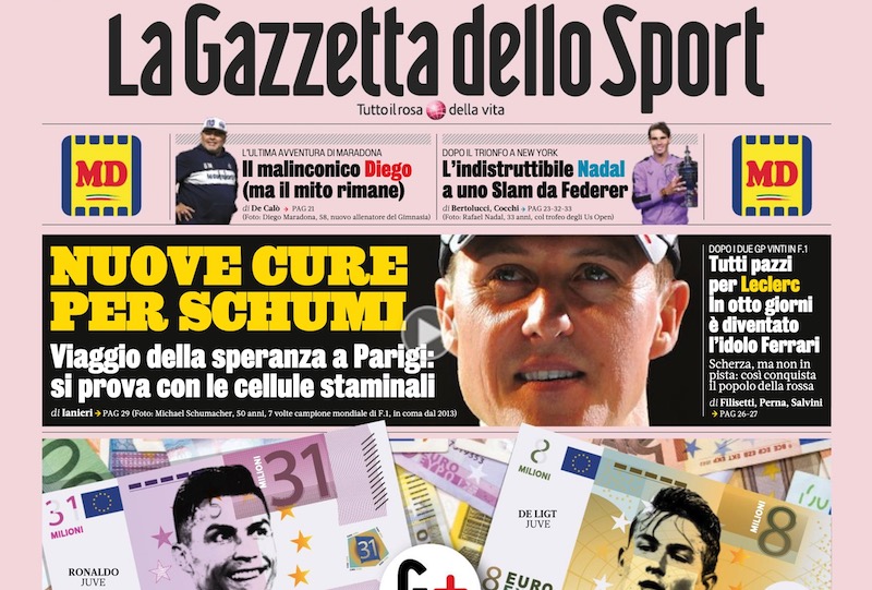 Il trasferimento di Michael Schumacher a Parigi per una cura sperimentale è la principale notizia riportata sui quotidiani sportivi di oggi.