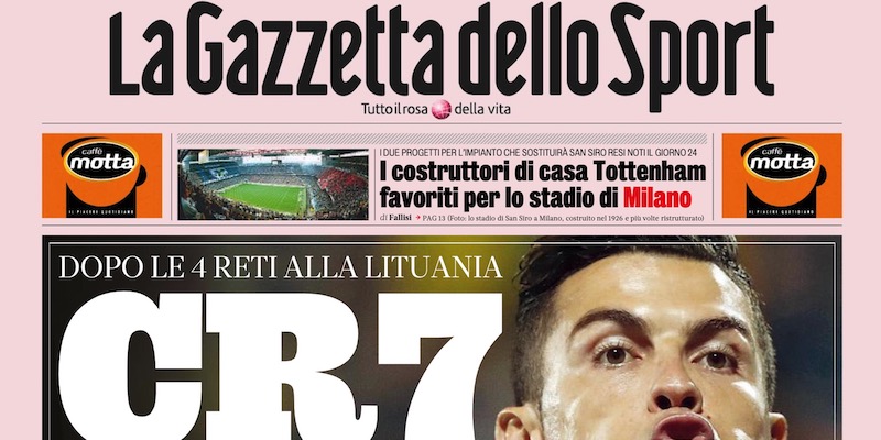 Un'intervista a Rocco Commisso, i quattro gol di CR7 alla Lituania e l'elezione di Zhang nell'ECA, sui quotidiani sportivi di oggi.