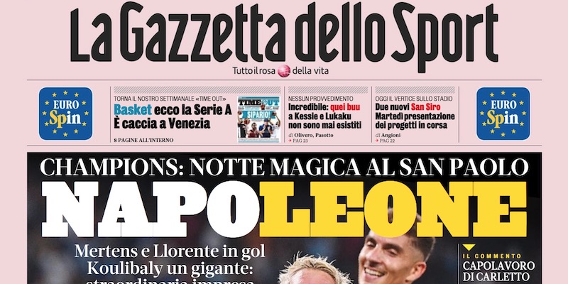 La gran bella vittoria del Napoli contro il Liverpool e il deludente pareggio dell'Inter contro lo Slavia Praga, oggi sulle prime pagine.