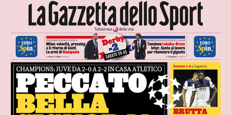 Il pareggio della Juventus a Madrid contro l'Atletico e la pesante sconfitta dell'Atalanta a Zagabria contro la Dinamo, oggi sui giornali.