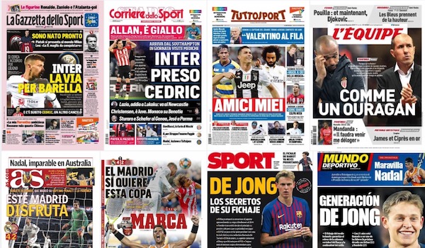 In apertura dei giornali sportivi di venerdì 25 gennaio si parla di nuove trattative di calciomercato: Barella e Cédric Soares per l'Inter.