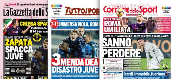 I clamorosi risultati dei quarti di finale di Coppa Italia, Atalanta-Juventus 3-0 e Fiorentina-Roma 7-1, sulle prime pagine di oggi.