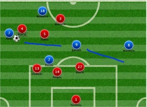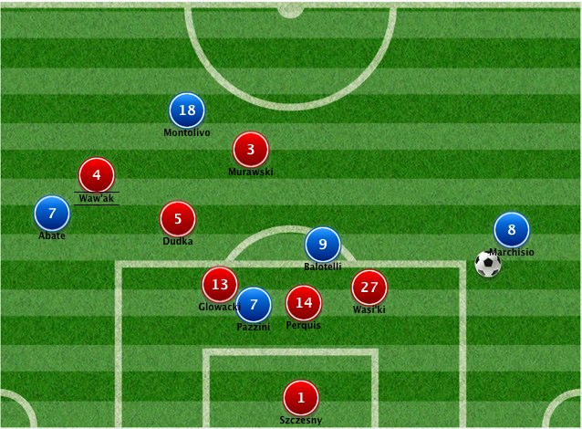 ...Marchisio riceve palla e ha spazio per entrare smarcato in area In questo caso Abate potrebbe, con o senza l’apporto di Balotelli, cambiare lato d’attacco favorendo l’inserimento dall’altra parte di Marchisio, altro giocatore al top in questo momento. Marchisio che poi avrebbe l’opportunità di accentrarsi e tirare o crossare per la testa di Pazzini. La stessa azione potrebbe naturalmente verificarsi al contrario, da sinistra verso destra.