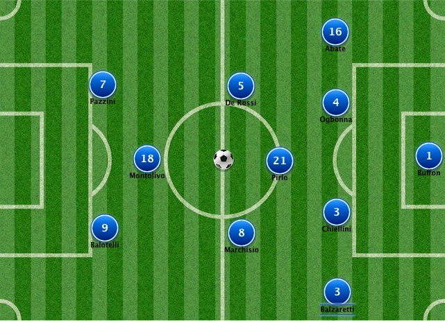 Il centrocampo a rombo degli azzurriSenza Cassano e Rossi, Prandelli deve cambiare volto alla sua Italia. Più che esperimenti il ct deve in questi mesi capire come affrontare l’Europeo senza i due attaccanti fin qui titolari che, molto probabilmente, non saranno recuperabili per giugno. In questa prima gara la scelta pare ricadere su Pazzini e Balotelli. In difesa spazio al neoconvocato Abate, che come vedremo potrebbe essere un’arma importante in questa gara, e ad Ogbonna, altro giocatore all’esordio dal primo minuto per via delle assenze di Barzagli e Ranocchia. Farà coppia con Chiellini, Balzaretti a sinistra. Centrocampo confermato col rombo: Pirlo vertice basso, De Rossi e Marchisio ai lati, Montolivo vertice alto.
