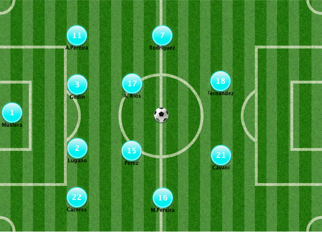 Tabarez deve rinunciare al tridente con cui manda in campo solitamente l’Uruguay. Quando la “Celeste” è al gran completo nel consueto 4-3-3 in attacco giocano Cavani e Forlan larghi sulla fascia e Suarez al centro per sfruttare al massimo il loro potenziale. Non appena manca uno dei tre, Tabarez opta per un più solido 4-4-2 (nel riquadro, cliccalo per ingrandire). A questo giro però oltre a Forlan mancherà anche Suarez, autore di una stepitosa quadripletta nell’ultimo match di qualificazione ai mondiali disputato contro il Cile.