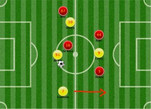 Una possibile ripartenza del Lecce Proprio il colombiano – come si vede nel riquadro – potrebbe godere di grande libertà nelle ripartenze. Spesso le azioni offensive della Roma lasciano i soli difensori centrali dietro la linea del centrocampo e preferiscono l’attacco sulla zona sinistra col cross di José Angel, ancora a secco di assist vincenti in stagione. Molti di questi cross avvengono dopo una manovra piuttosto lenta e con la difesa schierata è difficile trovare il passaggio giusto. E così, da un’azione di questo tipo, si potrebbe verificare un rapido capovolgimento di fronte con Cuadrado che avrebbe metri a disposizione per sfruttare la sua velocità e mantenere la superiorità numerica (quattro contro tre o quattro contro quattro a seconda della posizione di Rosi sull’altra fascia). I contropiedi non sfruttati dal Novara nell’ultimo turno sono la conferma che la Roma lascia colpevolmente spazio a ripartenze del genere. Nell’ultima occasione a Cesena, Cuadrado ha fatto tutto da solo andando a segnare, ma all’occorrenza avrà la collaborazione di altri due giocatori veloci e abili negli inserimenti come Olivera e Bertolacci, pronti a sfruttare il movimento a portare via l’uomo di Corvia.