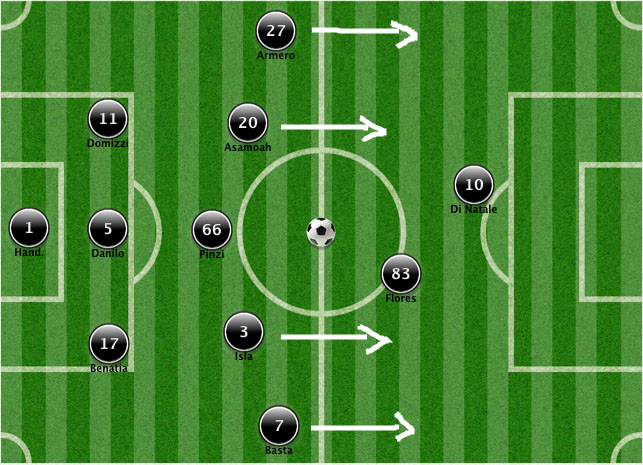 Come scritto la volta scorsa, azzeccare la formazione titolare di Luis Enrique per undici/undicesimi è più difficile che fare un terno al lotto e molti tifosi sul web ci hanno scherzato su dando vita al “TotoLuisito”. La scorsa volta il veggente c’è andato vicino centrandone nove. Rispetto alla formazione mandata in campo contro il Lecce ci dovrebbe essere un dubbio in meno. Totti è fermo ai box per un fastidio alla caviglia e non è stato convocato. In difesa mancherà invece Rosi e a questo punto è probabile che Luis Enrique sposti di fascia Taddei, uno dei migliori domenica scorsa, riproponendo José Angel nella sua fascia di competenza. Al centro confermati Heinze e Kjaer: non che abbiano convinto contro il Lecce, soprattutto quest’ultimo che potrebbe essere sostituito da Juan se il brasiliano sarà recuperato da un punto di vista fisico. Il 4-3-3 della Roma Anche nell’ultima esibizione il tecnico spagnolo ha provato una variante a centrocampo. Non più De Rossi davanti la difesa, ma Gago, per sorprendere gli avversari con gli inserimenti di “Capitan Futuro”. Nel secondo tempo si è tornati alla normalità e proprio l’argentino ha bucato Julio Sergio. Pjanic a centrocampo, Lamela, davvero un bel vedere il giovanissimo argentino, potrebbe essere riproposto alle spalle di Osvaldo e Bojan. Guidolin ha l’intera rosa a disposizione e pochi dubbi di formazione. A Parma l’errore è stato quello di dare fiducia a giocatori come Isla e Armero che di rientro dal Sudamerica non avevano il solito furore agonistico che richiede l’atteggiamento tattico dell’Udinese. Ma il colombiano e il cileno hanno avuto una settimana per tornare ad allenarsi con regolarità e saranno di nuovo al top. Difesa a tre con da sinistra verso destra Domizzi, Danilo e Benatia, a centrocampo Pinzi tuttofare com Asamoah. In avanti Floro Flores con Di Natale, che alla Roma sa come segnare: lo ha fatto ben 11 volte in carriera, è la sua vittima preferita insieme alla Sampdoria.Il 3-5-2 dell'Udinese Una curiosità per iniziare l’analisi dei pronostici: l’Udinese in cinque gare disputate in casa, tutte vinte, ha avuto la meglio nel confronto del possesso palla soltanto in una occasione, nel 3-0 contro il Novara. Col Bologna è stato pareggio (50% a testa), “sconfitte” nelle altre tre occasioni. Non c’è tanto da meravigliarsi. Il gioco di Guidolin è fatto così: almeno otto gli uomini che coprono Handanovic quando il pallone è degli avversari, coi soli Floro Flores e Di Natale che restano avanti per sfruttare le ripartenze guidate dai velocissimi Asamoah, Basta, Armero e Isla. Il segreto dei friulani è questo: attenzione meticolosa in fase difensiva e verticalizzazioni improvvise nelle ripartenze guidate dalla velocità dei quattro giocatori prima elencati. La Roma di Luis Enrique è l’avversaria ideale per fare questo gioco, visto che quando i giallorossi sono in possesso palla restano con tre uomini in fase difensiva, i due centrali più De Rossi o Gago visto che anche gli esterni giocano molto alti. Lo sa bene lo stesso Luis Enrique che nella conferenza stampa ha dichiarato: «Già so che contro l’Udinese avremo noi il controllo della palla e che la squadra di Guidolin ci aspetterà per farci male in contropiede. Ma la nostra proposta di gioco non è negoziabile, deve essere sempre la stessa a prescindere dall’avversario o dal risultato. Voglio che siano gli avversari ad adattarsi a noi e non l’inverso»