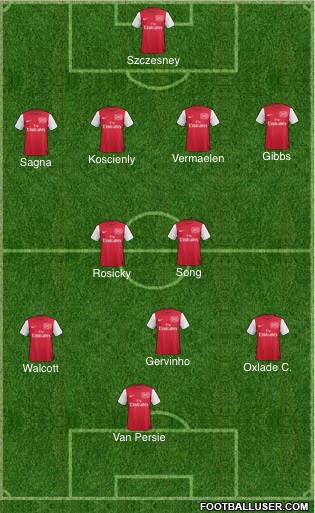 ARSENAL: Szczesney, Sagna, Vermaelen, Koscielny, Gibbs, Rosicky, Song, Walcott, Gervinho, Oxlade-Chamberlain, Van Persie.