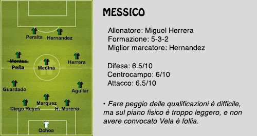 Non si è capito bene perché, ma Carlos Vela non giocherà i mondiali con il Messico. Rinunciare al calciatore più forte è stata una mossa poco furba (e già il fatto che uno come Vela sia il più forte la dice lunga su come stanno messi). Il Messico nel girone di qualificazione al Mondiale è arrivato dietro Usa, Costa Rica e Honduras, e se le classifiche significano qualcosa, vuol dire che il Messico è la squadra più scarsa della zona Concacaf. I calciatori più forti del Messico sono Guardado, Javier Hernandez e Giovani Dos Santos, eterne promesse incompiute del calcio mondiale. Il Messico passa la fase a gironi? No, e la quota è 1.65 su Snai che offre ai nuovi registrati un bonus di 15€ subito una volta associata la propria carta di credito al conto di gioco appena aperto.