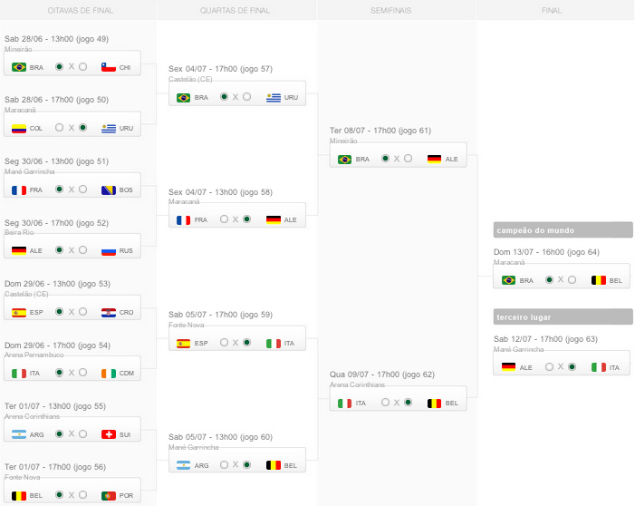Il nostro punto di riferimento per le grafiche di questa pagina è il sito sportivo brasiliano Globoesporte.com, sperando che non ci mandino gli sgherri a casa per aver saccheggiato selvaggiamente dalle loro pagine: il punto è che hanno un simulatore strafigo (basta cliccare in alto a destra su “ativar simulador” – hanno spesso simulatori del genere, in queste occasioni – che noi non siamo neppure lontanamente in grado di riprodurre tecnicamente, e che ci permette di visualizzare l’andamento del Mondiale a seconda dell’esito della fase a gironi e poi delle varie eliminatorie.