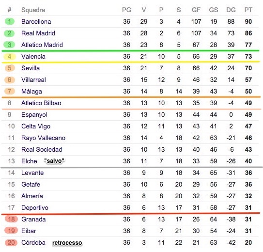 Le cose sono piuttosto definite sia in zona qualificazione in Champions League per via diretta (secondo e terzo posto) sia in zona qualificazione in Champions tramite playoff (quarto posto). Il Real Madrid è matematicamente sicuro del secondo posto. L’Atletico Madrid, al terzo posto, ha 4 punti di vantaggio sul Valencia, quarto: sembrerebbe un margine sufficiente all’Atletico per mantenere il terzo posto fino alla fine (anche perdendo domenica in casa contro il Barcellona, difficilmente l’Atletico lascerebbe poi punti a Granada nell’ultima giornata di campionato).