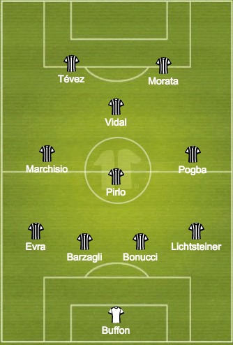 JUVENTUS (4-3-1-2): Buffon; Lichtsteiner, Bonucci, Barzagli, Evra; Pirlo, Marchisio, Pogba; Vidal; Morata, Tévez.