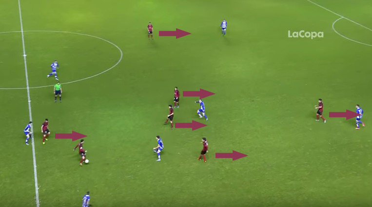Attualmente si trova all’undicesimo posto in classifica dopo ventuno giornate: nella partita di campionato giocata contro il Leganes domenica scorsa ha perso 4-0 dopo aver preso tre gol nei primi venti minuti. Ma, anche a causa del particolare modulo usato da Carlos Terrazas (gioca con la difesa a tre), il Mirandés – che ha nel venticinquenne ivoriano Lago Júnior uno dei suoi calciatori con più talento – tende a subire molti gol ma anche a segnarne tanti: ha il migliore attacco del campionato (30 gol), e quasi tutta la squadra partecipa alla fase offensiva. Per esempio: in trasferta, sul risultato di 2-0 contro il Deportivo, il Mirandés tendeva a rimanere stabilmente con sette uomini nel centrocampo avversario, come in occasione del terzo gol.