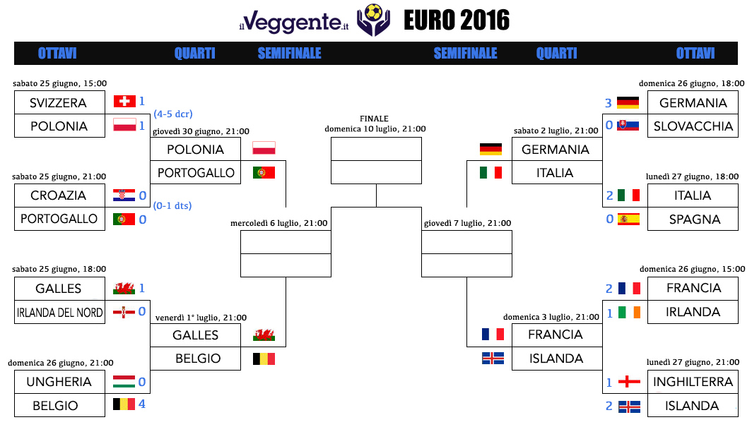 Il quadro completo dei quarti di finale dell’Europeo 2016, con giorni e orari delle partite (ormai tutte alle 21:00): oltre alla classica immortale Italia-Germania, sabato prossimo, un’altra da seguire con interesse è Galles-Belgio, venerdì.