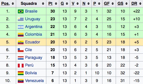 Si ritrovano adesso, a sei giornate dalla fine, in prima e in seconda posizione: il Brasile ha 27 punti e l’Uruguay 23. Una vittoria permetterebbe al Brasile di rafforzare saldamente il primo posto portando il vantaggio a sette punti sulla seconda in classifica, a prescindere dagli altri risultati (perché l’Uruguay ha a sua volta tre punti di vantaggio su Ecuador e Cile).