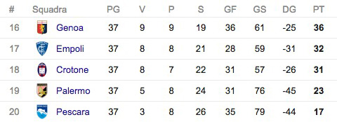 Nella classifica di Serie A il Palermo e il Pescara, rispettivamente con 23 punti e 17 punti, sono ormai da alcune settimane matematicamente escluse dalla possibilità di restare in Serie A anche nella prossima stagione. Resta da decidere quale sarà la terza e ultima squadra a retrocedere tra il Crotone, terzultimo con 31 punti, e l’Empoli, quartultimo con 32 punti. Nell’ultima giornata di Serie A, che si giocherà in larga parte alle 20:45 di domenica prossima, 28 maggio, il Crotone giocherà in casa contro la Lazio e l’Empoli giocherà in trasferta contro il Palermo. (In caso di parità nel punteggio finale, tra Crotone ed Empoli sarebbe in vantaggio il Crotone per maggior numero di gol segnati negli scontri diretti: ha perso 2-1 a Empoli e poi vinto 4-1 a Crotone).
