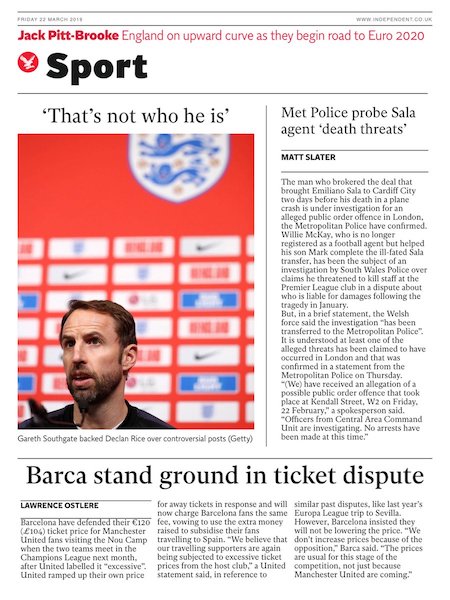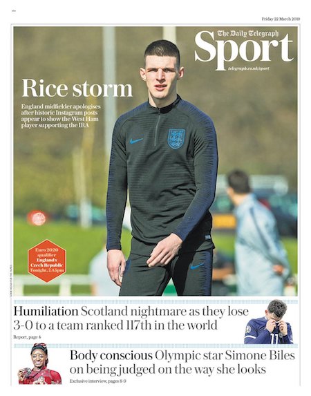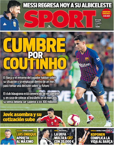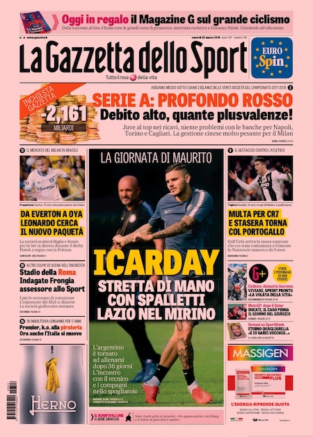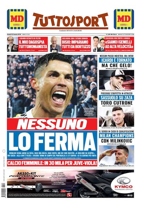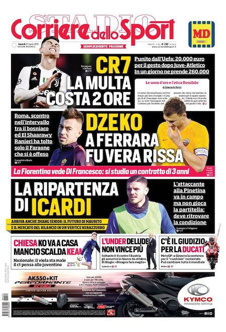 Le prime pagine di oggi riportano anche i due principali argomenti delle ore scorse. Come ampiamente previsto, l’attaccante portoghese Cristiano Ronaldo ha ricevuto una multa per una sua recente esultanza controversa, evitando così una più problematica squalifica. Il centravanti argentino Mauro Icardi, chiariti i dissidi con la società, almeno provvisoriamente, è tornato ad allenarsi con l’Inter dopo oltre un mese di assenza.