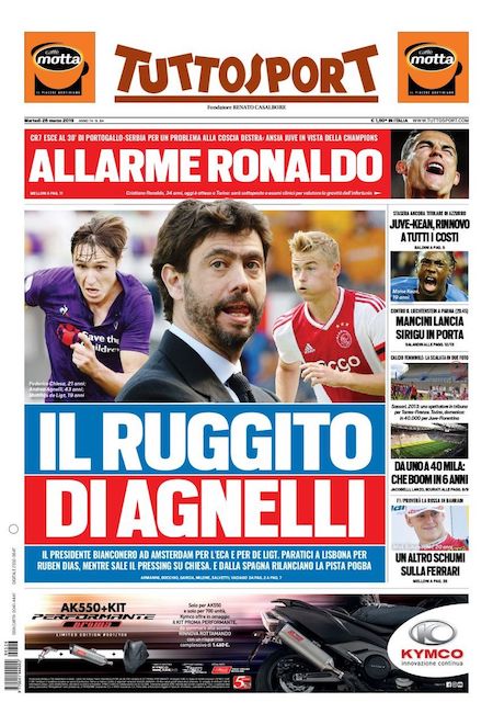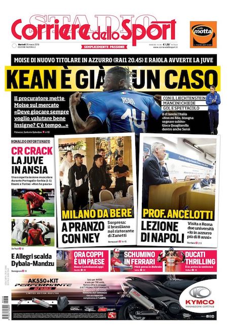 Un altro motivo di grande interesse sulle prime pagine dei quotidiani è l’infortunio di Cristiano Ronaldo durante Portogallo-Serbia, ieri sera a Lisbona. Dovrebbe essere di lieve entità, ai flessori della gamba destra. La Gazzetta riporta persino un virgolettato abbastanza rassicurante attribuito allo stesso Ronaldo: “io mi conosco, torno in 15 giorni”.