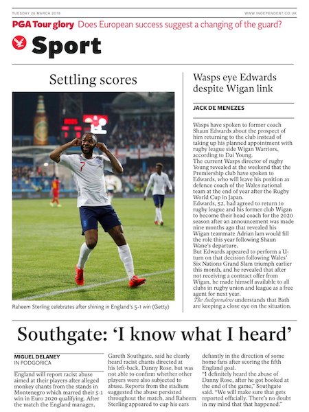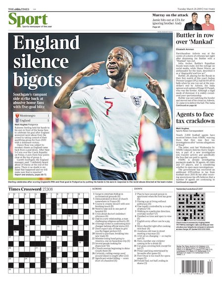 I giornali inglese celebrano la vittoria dell’Inghilterra per 5-1 in trasferta contro il Montenegro. Le fotografie sono quasi tutte dedicate a Raheem Sterling, autore del quinto gol, preso di mira da una parte del pubblico con una serie di insulti razzisti.