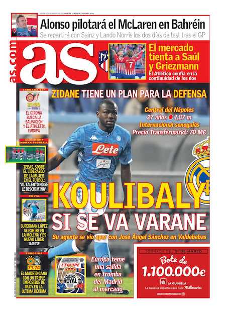 Oggi Koulibaly è anche in prima pagina su AS, popolare quotidiano sportivo spagnolo. Viene definito – per la prima volta con così tanta attenzione – un obiettivo di mercato del Real Madrid. Sarebbe, scrive AS, la prima scelta in caso di cessione del nazionale francese Raphael Varane.