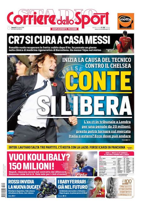 Un altro argomento in prima pagina, nel taglio basso del Corriere dello Sport, riguada il difensore senegalese Kalidou Koulibaly. Il Napoli starebbe considerando di inserire nel contratto di rinnovo una clausola da 150 milioni, valida soltanto per i club esteri.