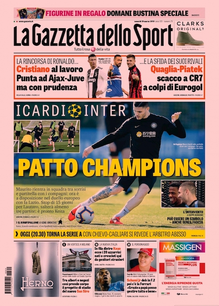 La Gazzetta dello Sport apre l’edizione di oggi, venerdì 29 marzo, destinando ampio spazio in prima pagina a Mauro Icardi. Il centravanti argentino dell’Inter è tornato ad allenarsi da poco con il resto della squadra, dopo una lunga assenza per contrasti con la società. Potrebbe essere convocato già per la partita di domenica sera a San Siro contro la Lazio, considerando che Lautaro Martinez, attaccante attualmente titolare, è infortunato.