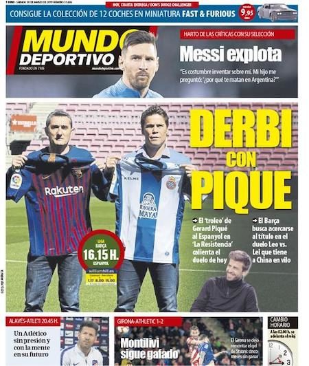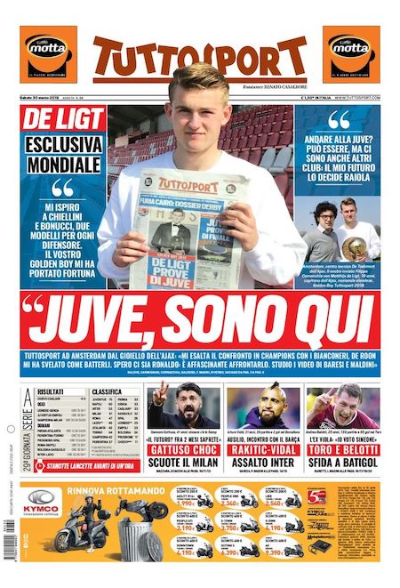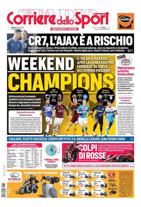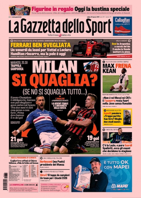 Le prime pagine di tutti i principali quotidiani sportivi italiani di oggi, sabato 30 marzo, presentano le partite della 29ª giornata di Serie A. Stasera si gioca Sampdoria-Milan, una delle tre partite fondamentali di questo turno per il terzo e il quarto posto contesi tra Inter, Milan, Roma e Lazio. Le altre due sono Roma-Napoli e Inter-Lazio, entrambe in programma domani.