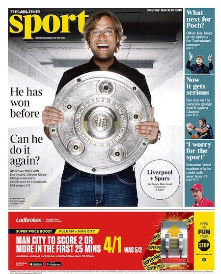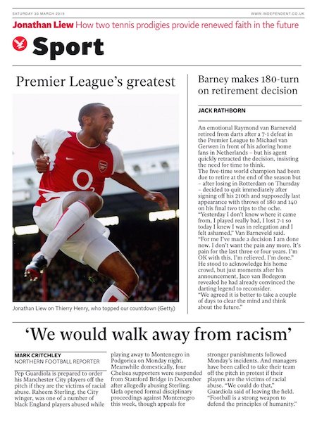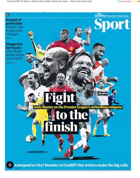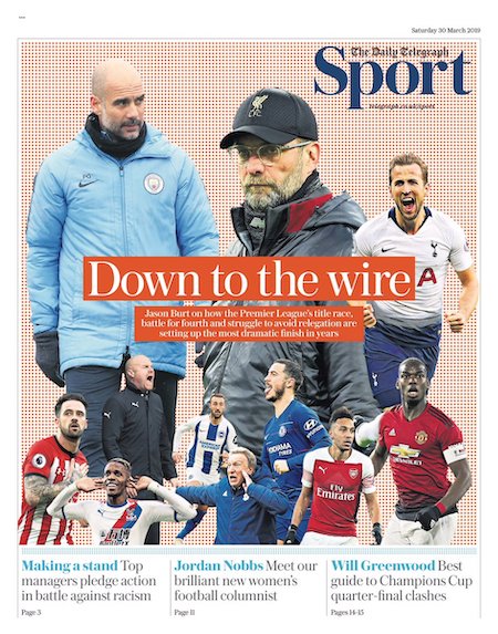 In Premier League si gioca la 32ª giornata: ne mancano otto alla fine del campionato, ancora apertissimo in tutte le parti più importanti della classifica. Le sezioni sportive dei principali quotidiani britannici di oggi, in particolare il Guardian e il Telegraph, hanno interessanti approfondimenti sul campionato, introdotti da prime pagine molto ben allestite graficamente.