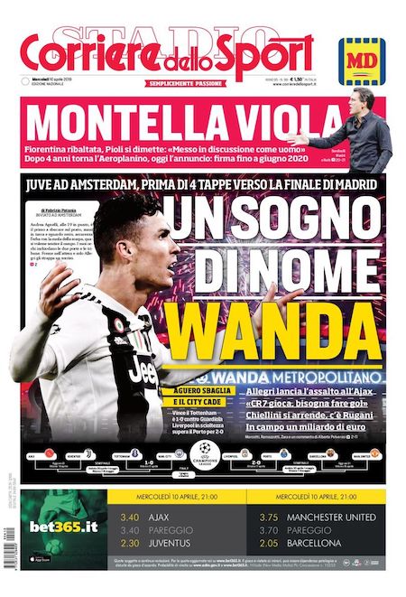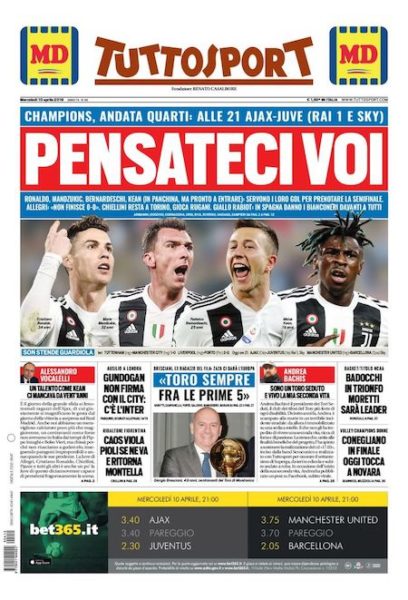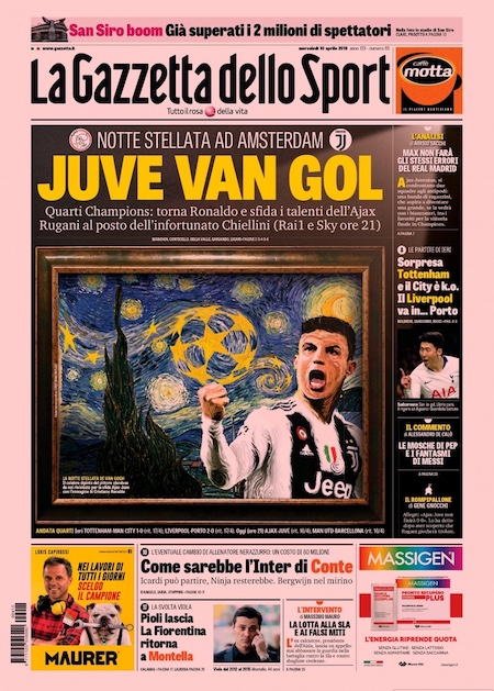 Le prime pagine dei principali quotidiani sportivi di oggi, mercoledì 10 aprile, sono largamente dedicate alla partita Ajax-Juventus. È l’andata dei quarti di finale di Champions League, si gioca stasera ad Amsterdam alle 21:00. La notizia più diffusa sulle prime pagine, nelle presentazioni della partita, è la disponibilità di Cristiano Ronaldo confermata dall’allenatore della Juventus Massimiliano Allegri.