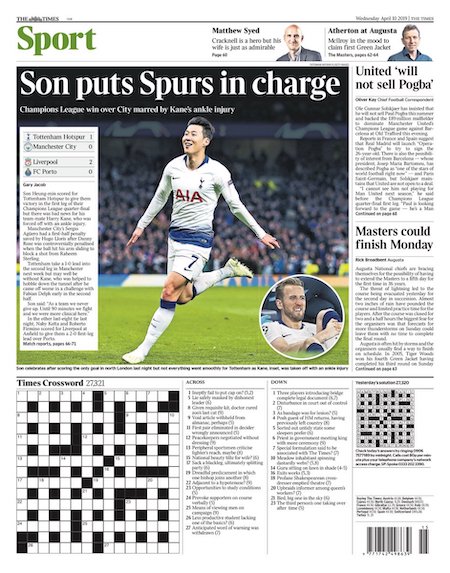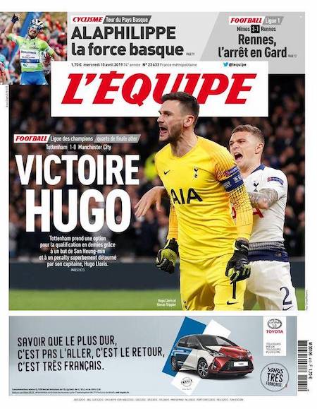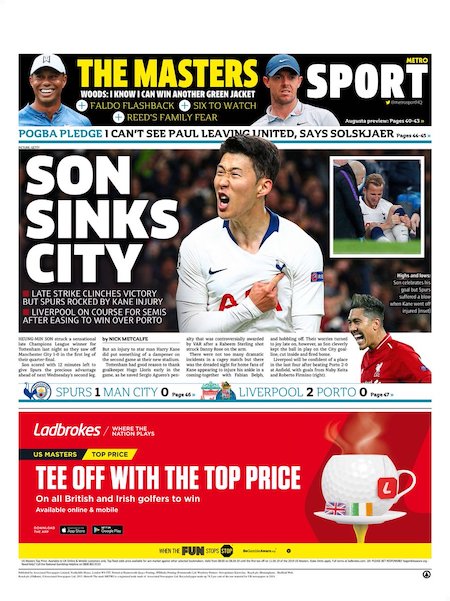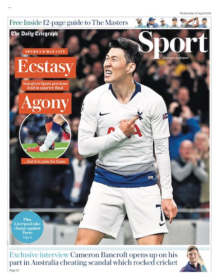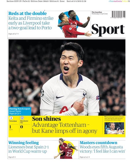 Le sezioni sportive dei giornali britannici sono dedicate a Son Heung-min, autore del gol che ieri sera ha permesso al Tottenham di battere 1-0 il Manchester City nell’andata del derby inglese dei quarti di finale di Champions League. Il quotidiano francese L’Équipe dedica la prima pagina proprio al portiere del Tottenham e della nazionale francese Hugo Lloris, che ieri ha parato un calcio di rigore battuto da Sergio Aguero nel primo tempo. È stato il terzo rigore su tre parati da Lloris nel 2019.