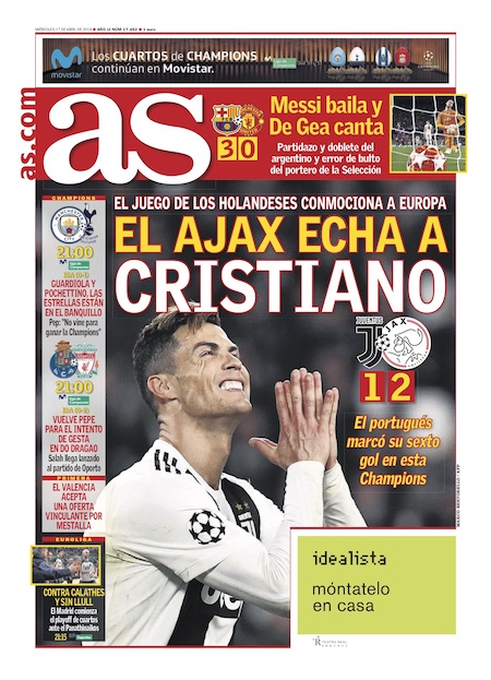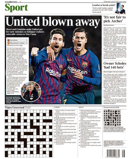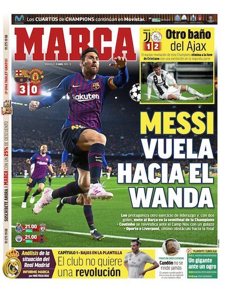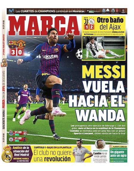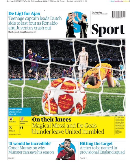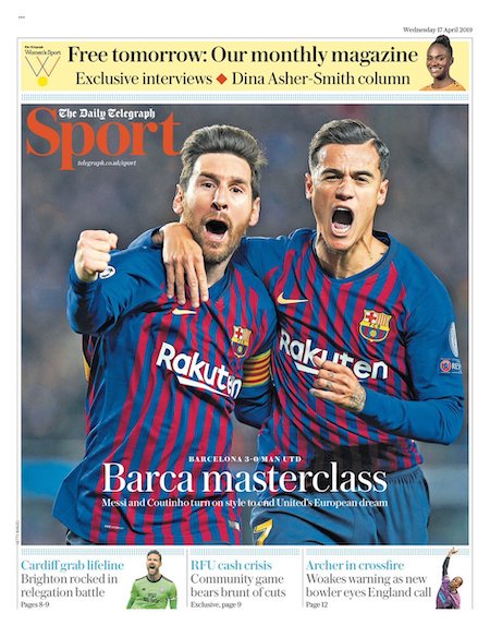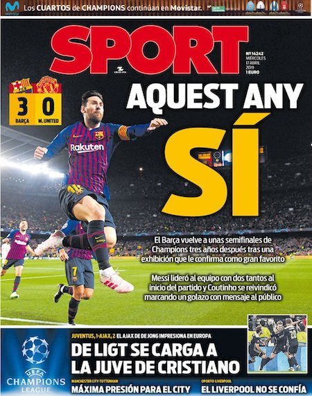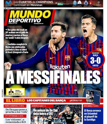 I giornali spagnoli e inglesi dedicano le prime pagine all’altra semifinale, quella vinta per 3-0 dal Barcellona contro il Manchester United con due gol di Leo Messi e uno di Philippe Coutinho. Il Barcellona era riuscito a vincere anche la partita di andata, per 1-0, all’Old Trafford una settimana fa.