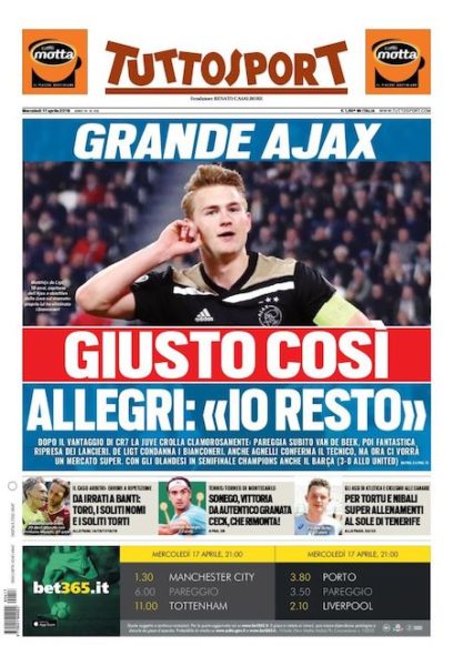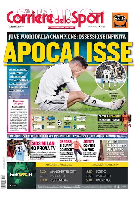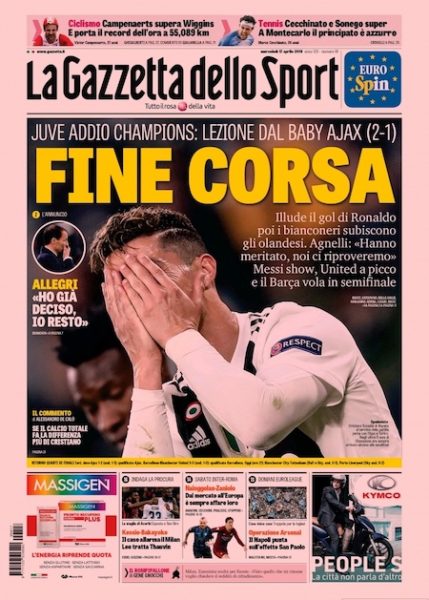 “Fine corsa” e “Apocalisse” sono i titoli scelti dai due principali quotidiani sportivi italiani per definire l’eliminazione della Juventus dalla Champions League. Ieri la squadra allenata da Massimiliano Allegri ha perso 2-1 a Torino contro l’Ajax, nel ritorno dei quarti di finale. La partita dell’andata, ad Amsterdam, era finita con un pareggio per 1-1.