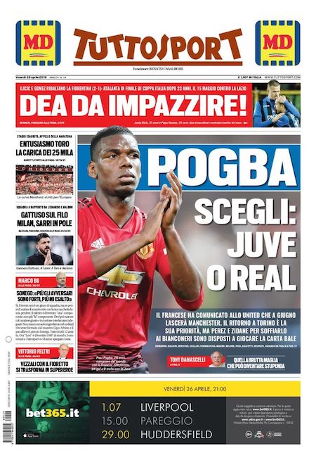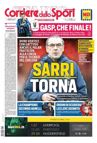 I principali giornali sportivi dedicano le prime pagine all’Atalanta, che ieri ha battuto per 2-1 la Fiorentina nella semifinale di ritorno della Coppa Italia. Dopo aver subìto un gol dopo appena tre minuti, la squadra allenata da Gian Piero Gasperini ha segnato quello del pareggio con Josip Ilicic al 14° e quello della vittoria con Papu Gomez al 69°. La partita di andata era terminata 3-3.