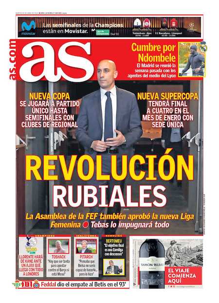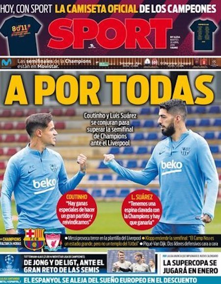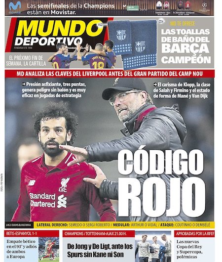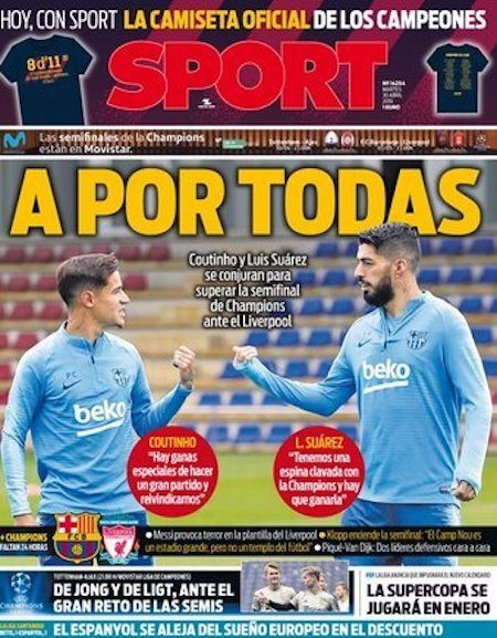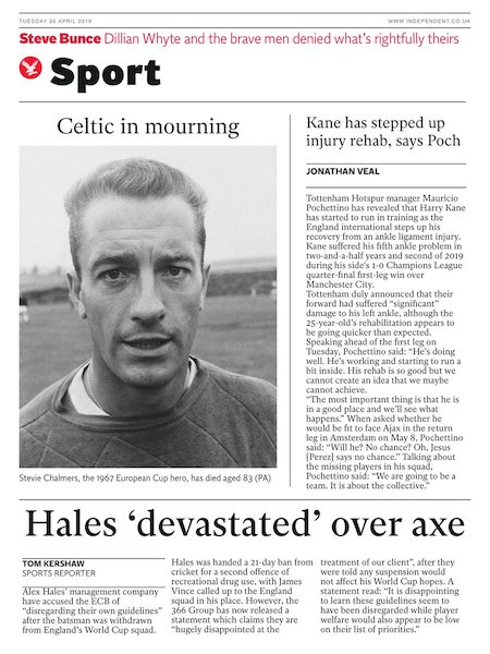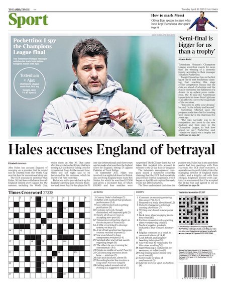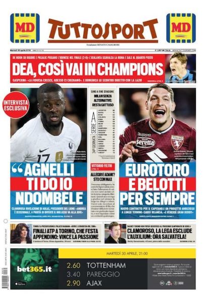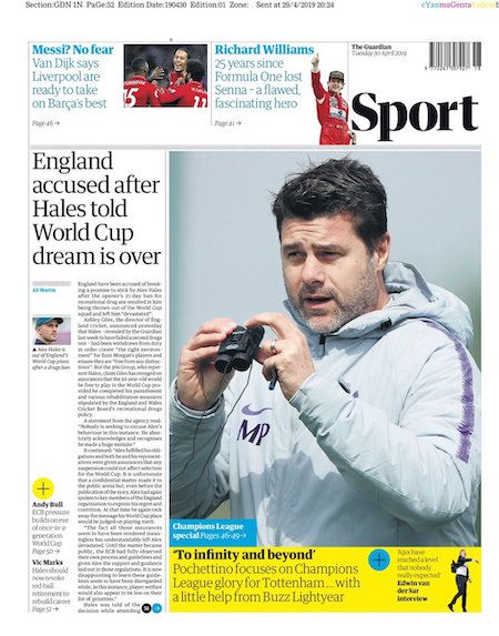 Le pagine internazionali dedicato allo sport trattano principalmente la partita di Champions League di stasera tra il Tottenham e l’Ajax. È la semifinale di andata e si gioca al New White Hart Lane, tra due squadre che nei quarti hanno battuto il Manchester City e la Juventus, ossia le più accreditate alla vittoria di questa competizione insieme al Barcellona e al Liverpool, che si affronteranno nell’altra semifinale.