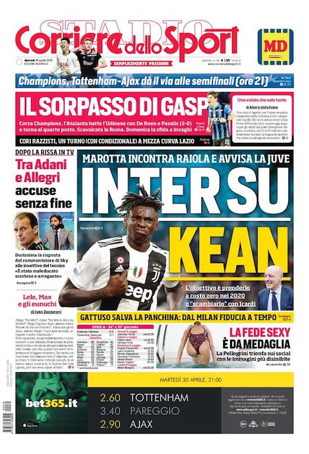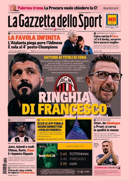 Tra le altre notizie in prima pagina il Corriere dello Sport riferisce di un interesse dell’Inter per il diciannovenne centravanti italiano Moise Kean della Juventus. La Gazzetta dello Sport dedica ampio spazio alla probabile prossima fine del rapporto di lavoro tra il Milan e il suo allenatore Gennaro Gattuso, alla conclusione di questa stagione. Al suo posto la società starebbe valutando la possibilità di contattare Eusebio Di Francesco, ex allenatore della Roma.
