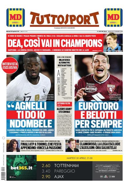 I principali quotidiani sportivi italiani dedicato il taglio alto delle loro prime pagine di oggi alla vittoria dell’Atalanta nel posticipo della 34ª giornata. Ieri ha battuto per 2-0 l’Udinese, con un gol di Marten de Roon all’81° minuto e un altro di Mario Pasalic all’85°. Grazie a questa vittoria la squadra allenata da Gian Piero Gasperini occupa ora da sola il quarto posto in classifica, con tre punti in meno dell’Inter e uno di vantaggio sulla Roma.