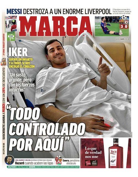 Altre informazioni riportate sulle pagine sportive internazionali sono quelle relative all’infarto avuto ieri in allenamento dal portiere spagnolo Iker Casillas. Soccorso immediatamente e ricoverato nell’ospedale privato CUF Hospital Porto, il portiere del Porto ed ex storico titolare del Real Madrid è stato sottoposto a un intervento chirurgico e dichiarato fuori pericolo. Dal letto dell’ospedale ha comunicato di star bene e ringraziato per i molti messaggi di solidarietà ricevuti.