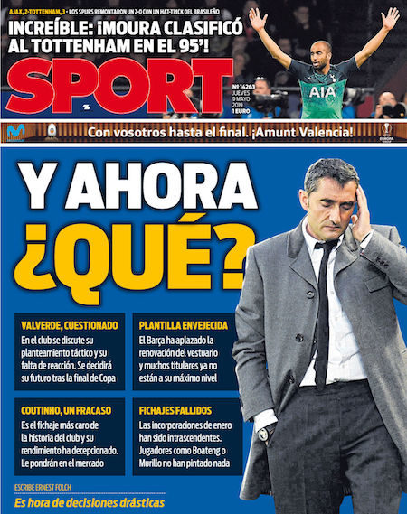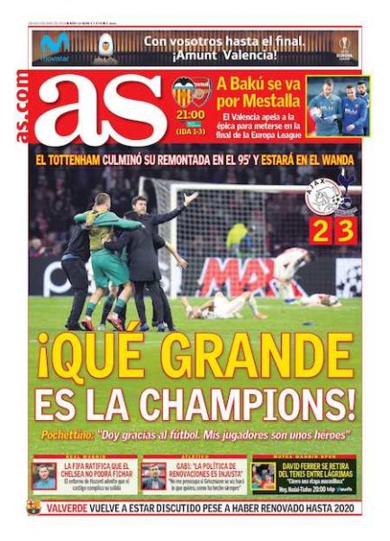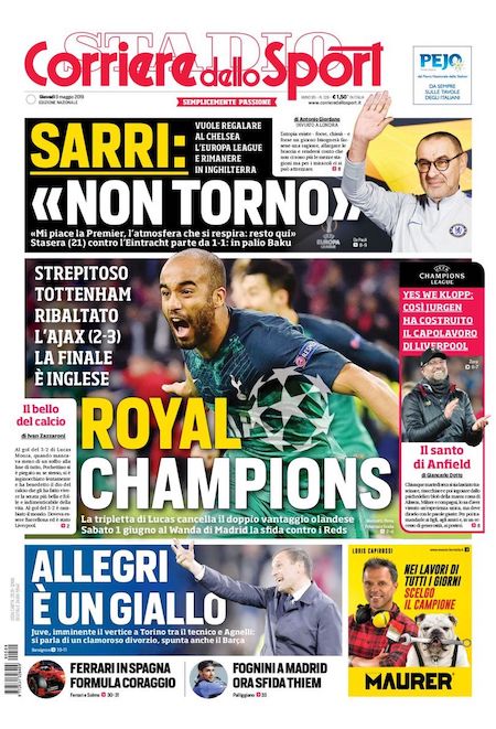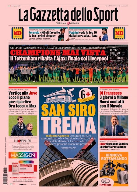 I principali giornali sportivi di oggi, giovedì 9 maggio, aprono con la clamorosa qualificazione del Tottenham alla finale di Champions League del 1° giugno. Ieri sera ad Amsterdam, alla Johan Cruijff Arena, si è giocata la seconda semifinale: è finita 3-2 per il Tottenham di Mauricio Pochettino. L’Ajax, che partiva da un vantaggio di 1-0 nella partita di andata, è riuscito a segnare due gol prima della fine del primo tempo.