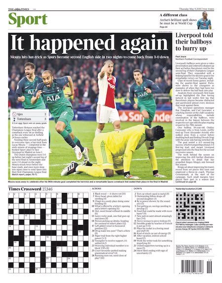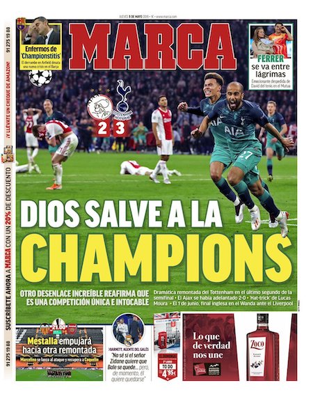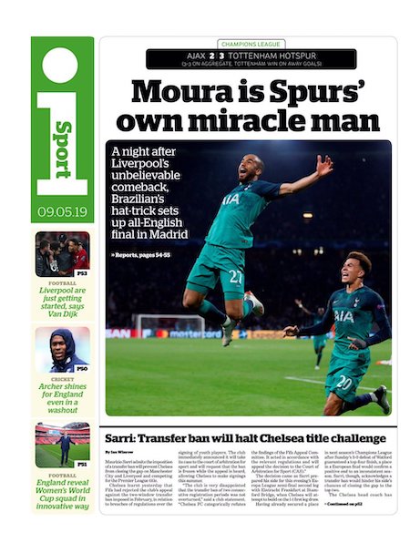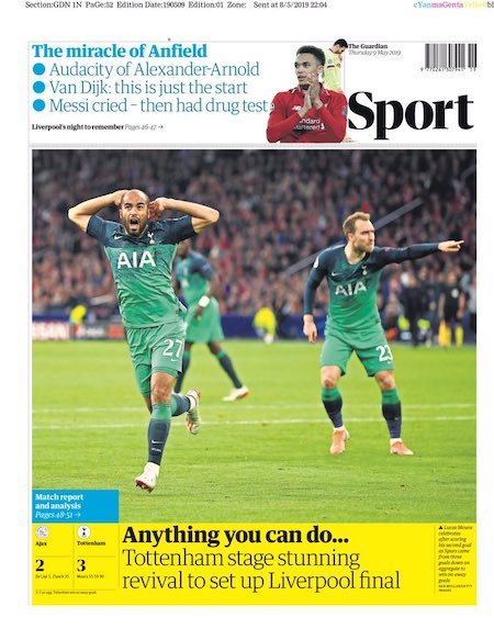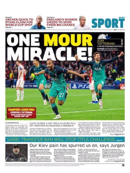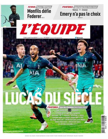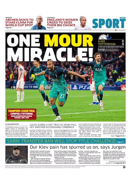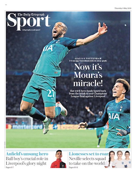 Nel secondo tempo il Tottenham ha mostrato fin da subito di poterla riprendere. A Lucas Moura, grande protagonista della serata, sono dedicate tutte le pagine sportive dei giornali britannici. È stato lui l’autore di tutti e tre i gol che hanno permesso al Tottenham di vincere la partita. Il terzo lo ha segnato negli ultimi secondi del tempo di recupero.