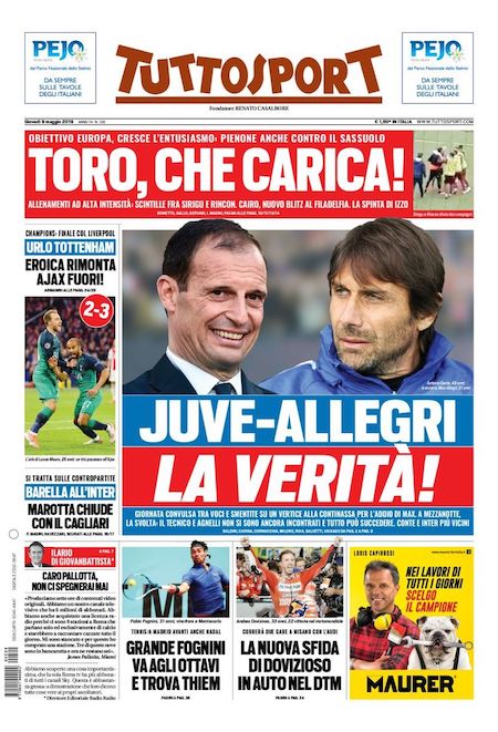 I quotidiani sportivi italiani danno conto in prima pagina anche dell’evoluzione dei rapporti tra la Juventus e il suo allenatore Massimiliano Allegri. La Gazzetta dello Sport, più cauta, non sembra tenere conto di alcune ultimissime su una presunta rescissione imminente del contratto tra Allegri e la Juventus. Questa ipotesi, senza ricevere alcuna conferma ufficiale, è circolata molto ieri sera insieme a quella di un clamoroso ritorno di Antonio Conte, che la Gazzetta continua invece a ritenere “molto vicino” all’Inter.