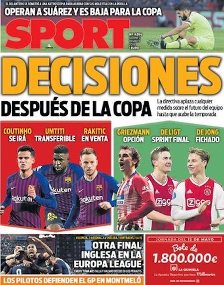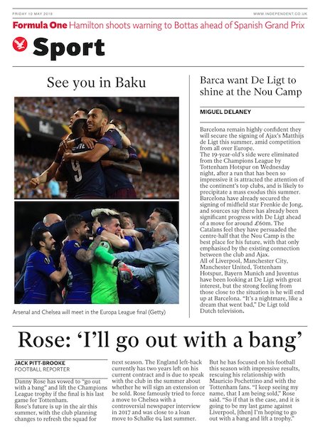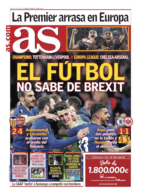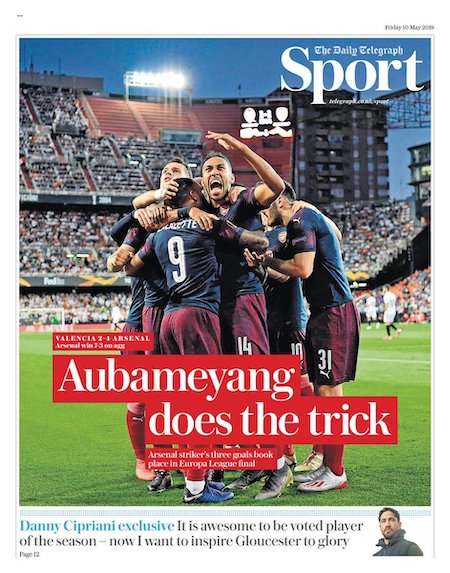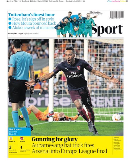 Le prime pagine più suggestive e graficamente apprezzabili di oggi sono quelle sportive nei quotidiani britannici. Per la prima volta nelle finali della Champions League e della Europa League si affronteranno soltanto squadre inglesi. Dopo le clamorose qualificazioni del Liverpool e del Tottenham nei giorni scorsi, ieri il Chelsea e l’Arsenal hanno ottenuto la qualificazione alla finale di Europa League.