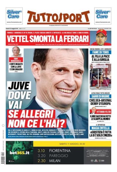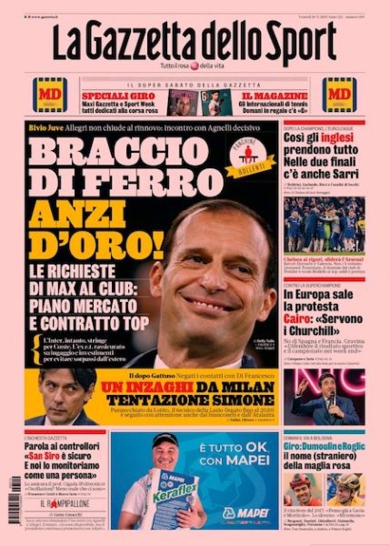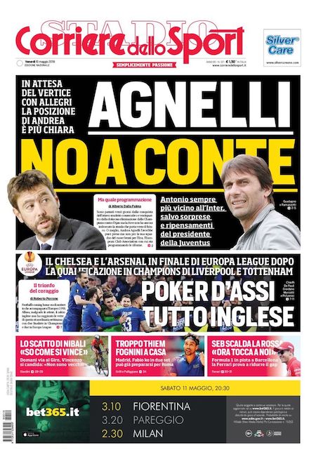 I giornali italiani danno oggi ancora risalto alle presunte trattative in corso tra la Juventus e il suo allenatore Massimiliano Allegri. Il Corriere dello Sport esclude con una certa fermezza che tali trattative possano essere condizionate dalla valutazione di Antonio Conte da parte della Juventus come alternativa ad Allegri.