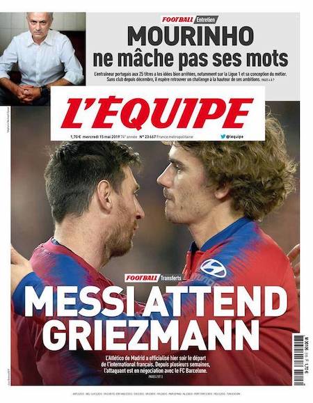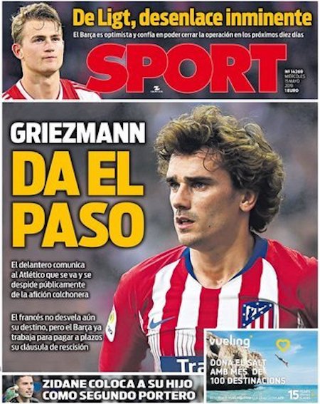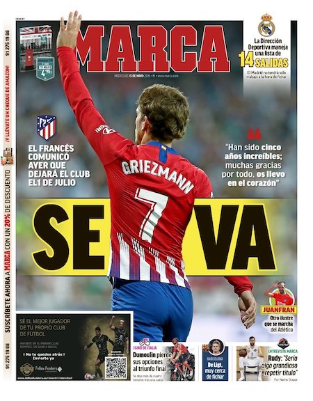 L’altro importante annuncio di ieri, presente su tutte le prime pagine dei quotidiani sportivi spagnoli, riguarda il centravanti francese Antoine Griezmann. Come intuito nelle settimane scorse da molti addetti, Griezmann ha deciso e comunicato che lascerà l’Atletico Madrid al termine di questa stagione. Il Barcellona è la sua destinazione più probabile, e in molti prevedono che questa operazione di mercato possa avviarne diverse altre tra i grandi club del calcio europeo.
