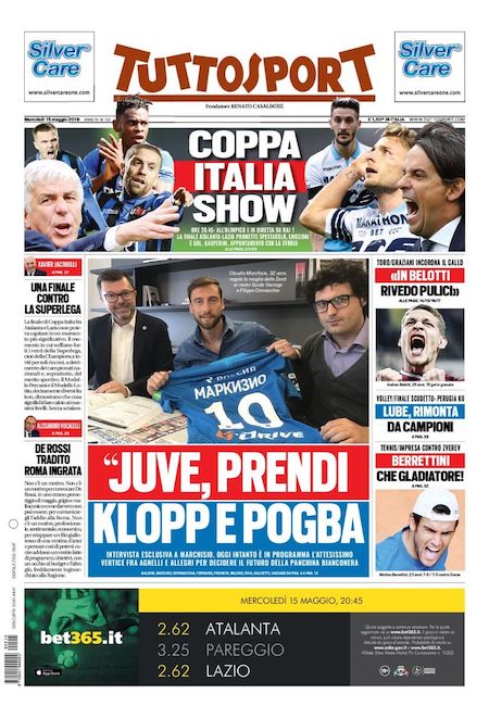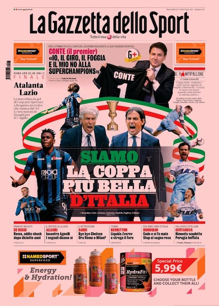 Le prime pagine dei quotidiani sportivi italiani sono in larga parte dedicati alla finale di Coppa Italia tra la Lazio e l’Atalanta. Si giocherà stasera alle 20:45, allo stadio Olimpico a Roma. La Lazio ha vinto questo trofeo sei volte, l’ultima delle quali nel 2013. L’Atalanta, che in campionato si sta giocando il quarto posto, ha vinto la Coppa Italia soltanto una volta nella sua storia, nel 1963.