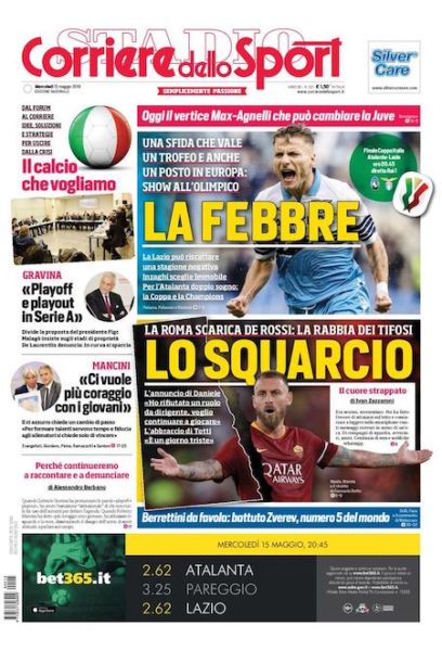 “La Roma scarica De Rossi: la rabbia dei tifosi”, scrive il Corriere dello Sport a proposito dell’annuncio di ieri. A fine stagione Daniele De Rossi non sarà più un giocatore della Roma, ha reso noto la società, che ha scelto di non rinnovare il contratto con il suo attuale capitano. De Rossi, rifiutando un ruolo da dirigente, ha detto di sentirsi ancora un calciatore e che non sa ancora dove giocherà nella prossima stagione.