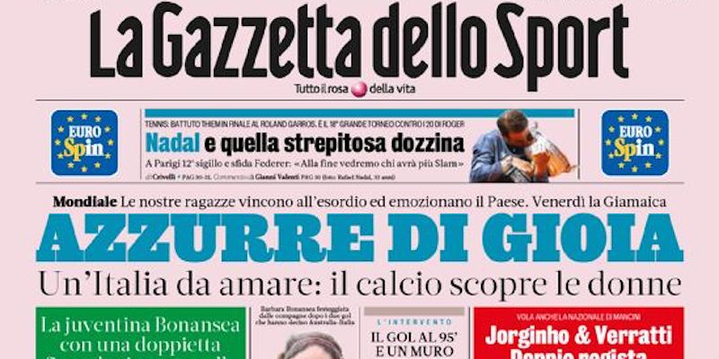 Le prime pagine dei principali quotidiani sportivi di oggi sono dedicate alla vittoria della nazionale italiana di calcio alla prima partita del Mondiale femminile, in Francia. Ieri, a Valenciennes, ha battuto 2-1 l’Australia nella prima partita della fase a gironi del gruppo C. Dopo essere passata in svantaggio nel primo tempo per un calcio di rigore, la nazionale guidata da Milena Bertolini ha giocato una gran secondo tempo. Barbara Bonansea, ventisettenne attaccante della Juventus, ha segnato il gol del pareggio al 56° e quello della vittoria all’ultimo minuto del tempo di recupero. L’Italia giocherà di nuovo venerdì prossimo, contro la Giamaica.